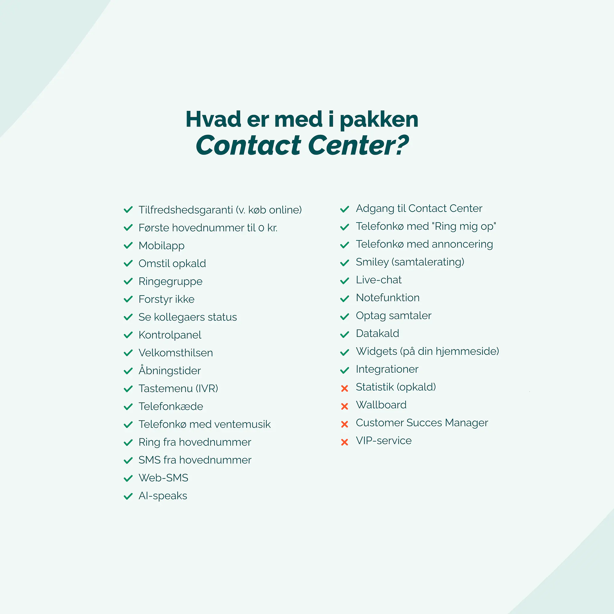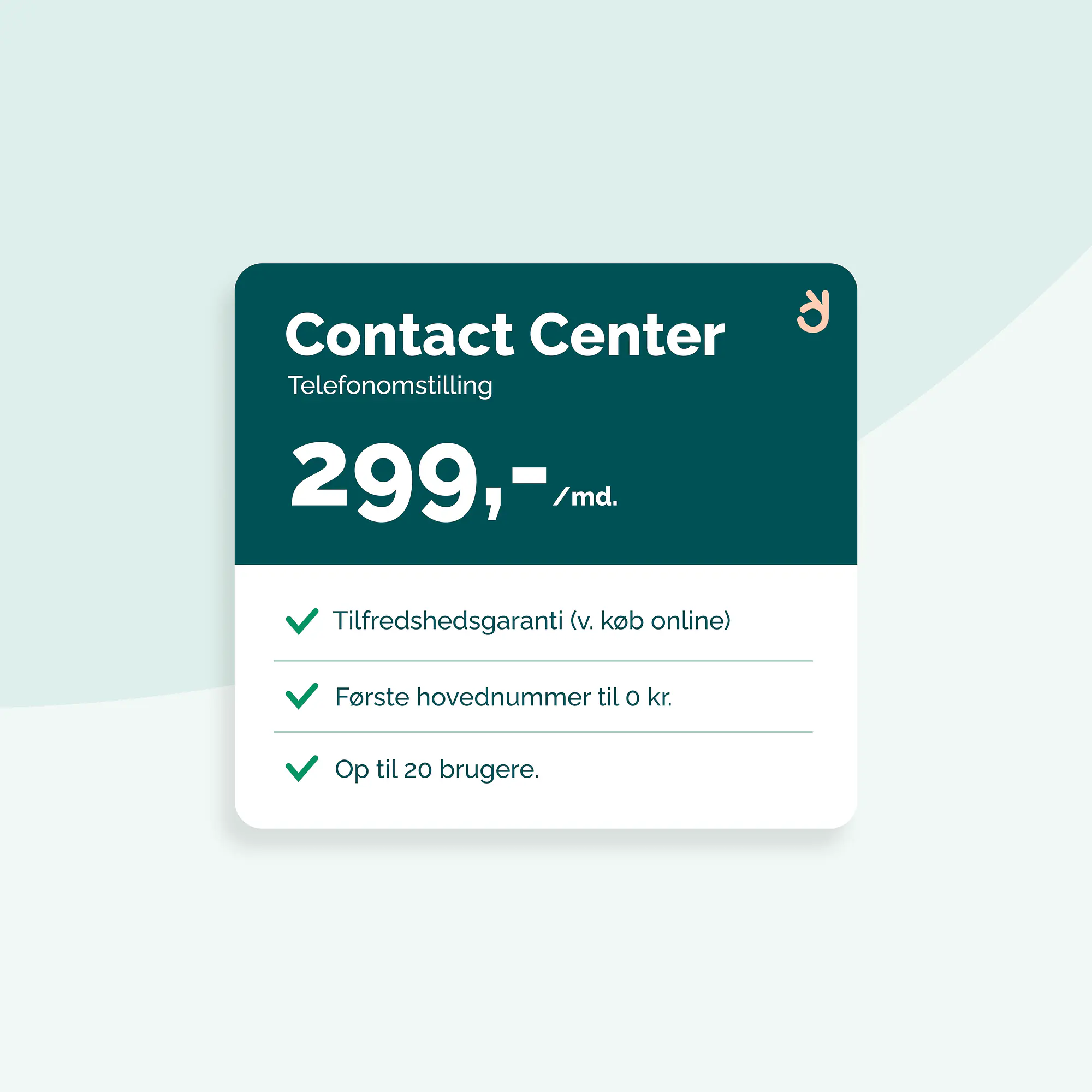 Contact Center hjælper jer med at levere målbar god kundeservice. I får alle funktionerne fra Omstilling Professional plus funktioner som køstyring, “smiley”-målinger og noter, så I kan sikre, at ingen kundehenvendelser går tabt, og at al kommunikation dokumenteres. Løsningen gør det nemt at følge op, optimere jeres service og skabe loyalitet - perfekt til virksomheder, der vil have styr på både opkald og kundedata.