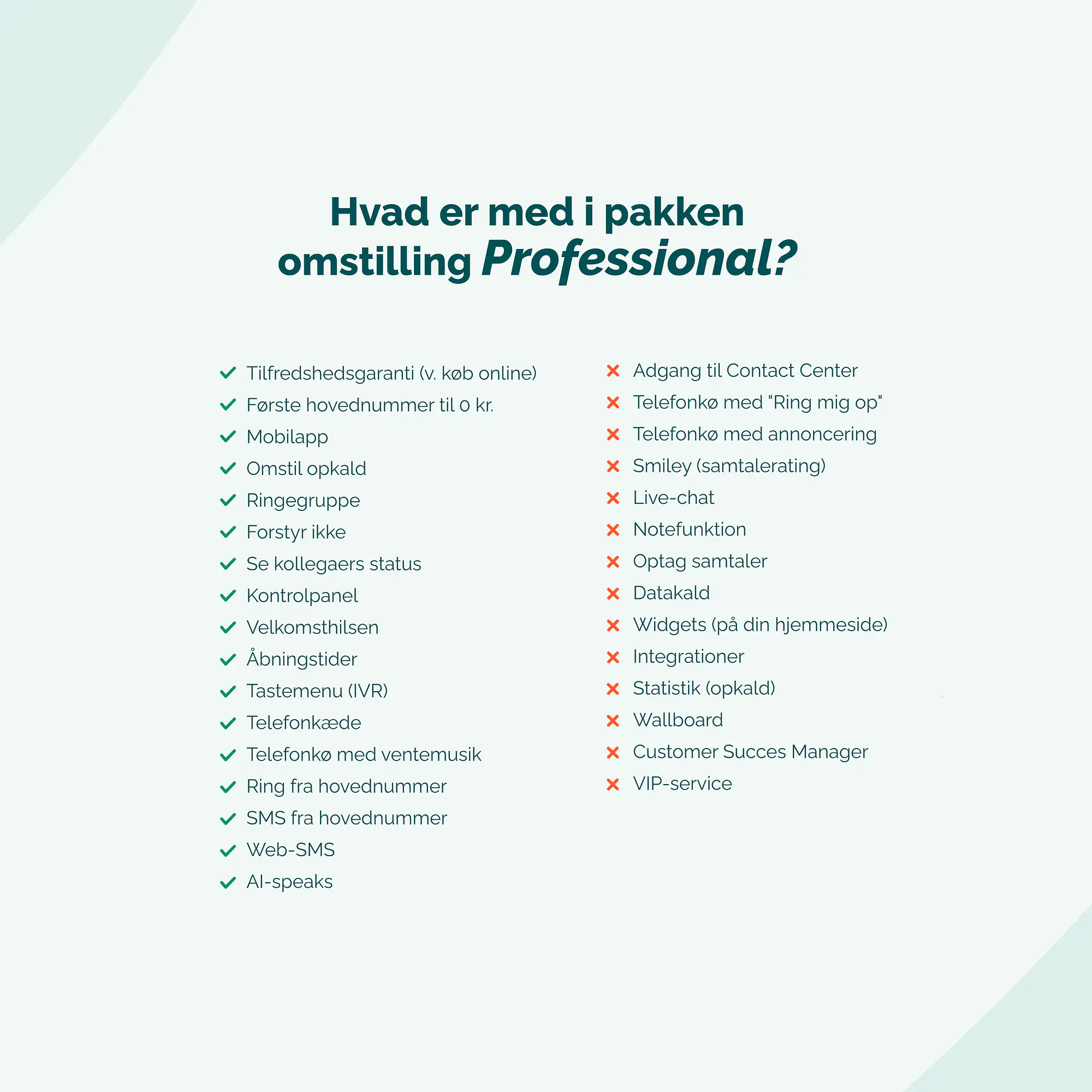Omstilling Professional sikrer, at du altid kan møde dine kunder professionelt, når de ringer. Hovednummer, velkomsthilsen, tastemenu og køfunktioner betyder, at du kan håndtere opkald effektivt, og at ingen kunder går tabt. Løsningen giver dig kontrol over opkald, sparer tid og sikrer, at kunder ikke bliver frustrerede - også uden store systemer eller ekstra personale.